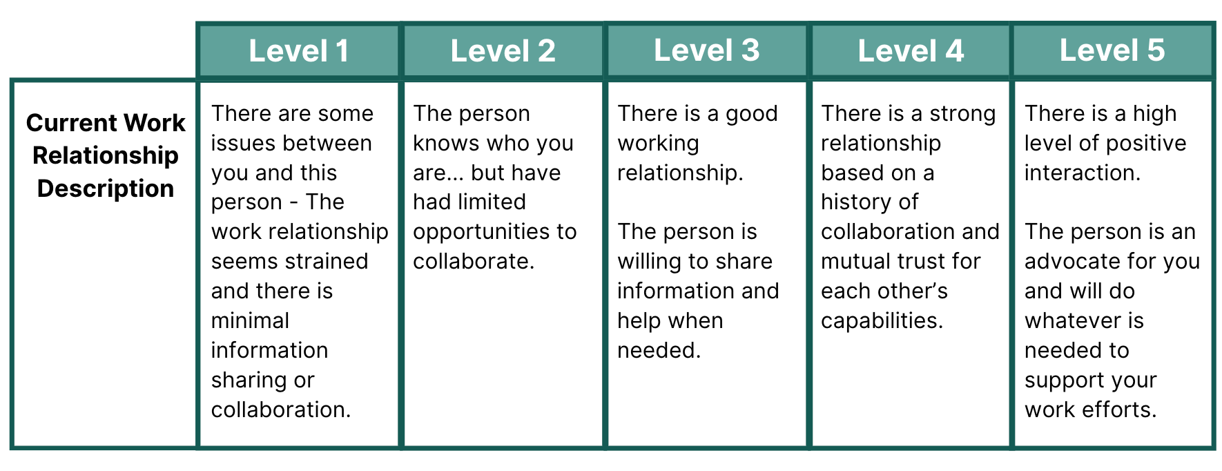 STEP 3: Outline the “DESIRED LEVEL” of work relationship. All work relationships need to be somewhere between Level 2 and Level 5. Utilize the following scale to assess the relationship level: