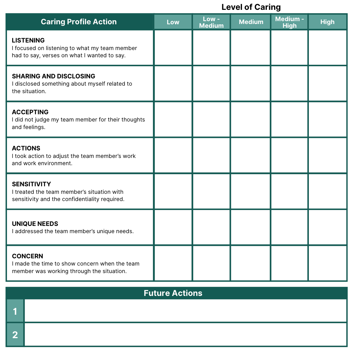 STEP 2: Review the Caring Profile Actions. Based on your own perception, determine what level of “caring” you offered the team member for each Caring Profile Action. Place an "X" in the correct box to make down your level.