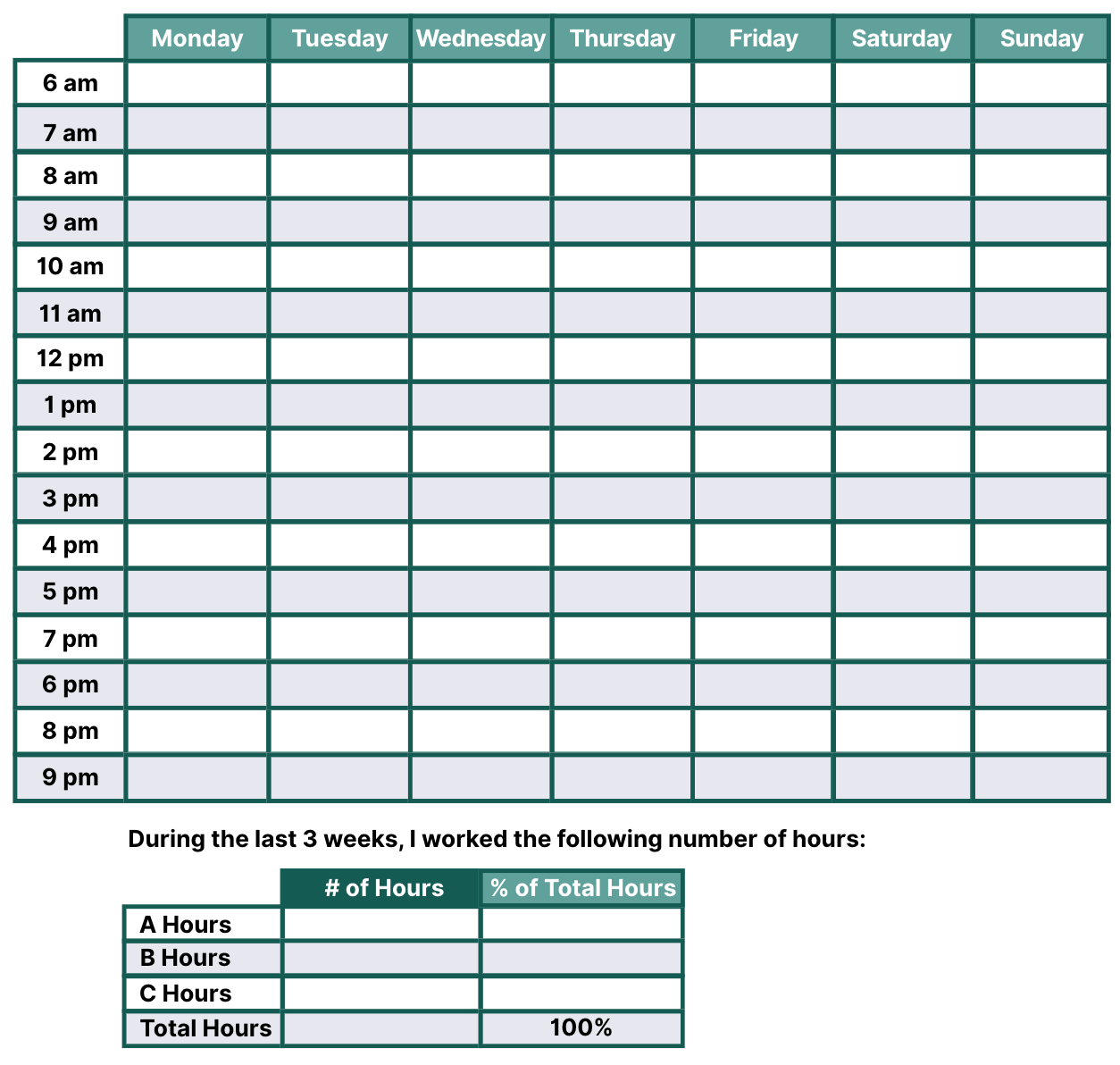 STEP 2: Team members review their schedule for the previous three weeks and record on the worksheet how many of their hours worked (in the last 3 weeks) were A Hours, B Hours, and C Hours.