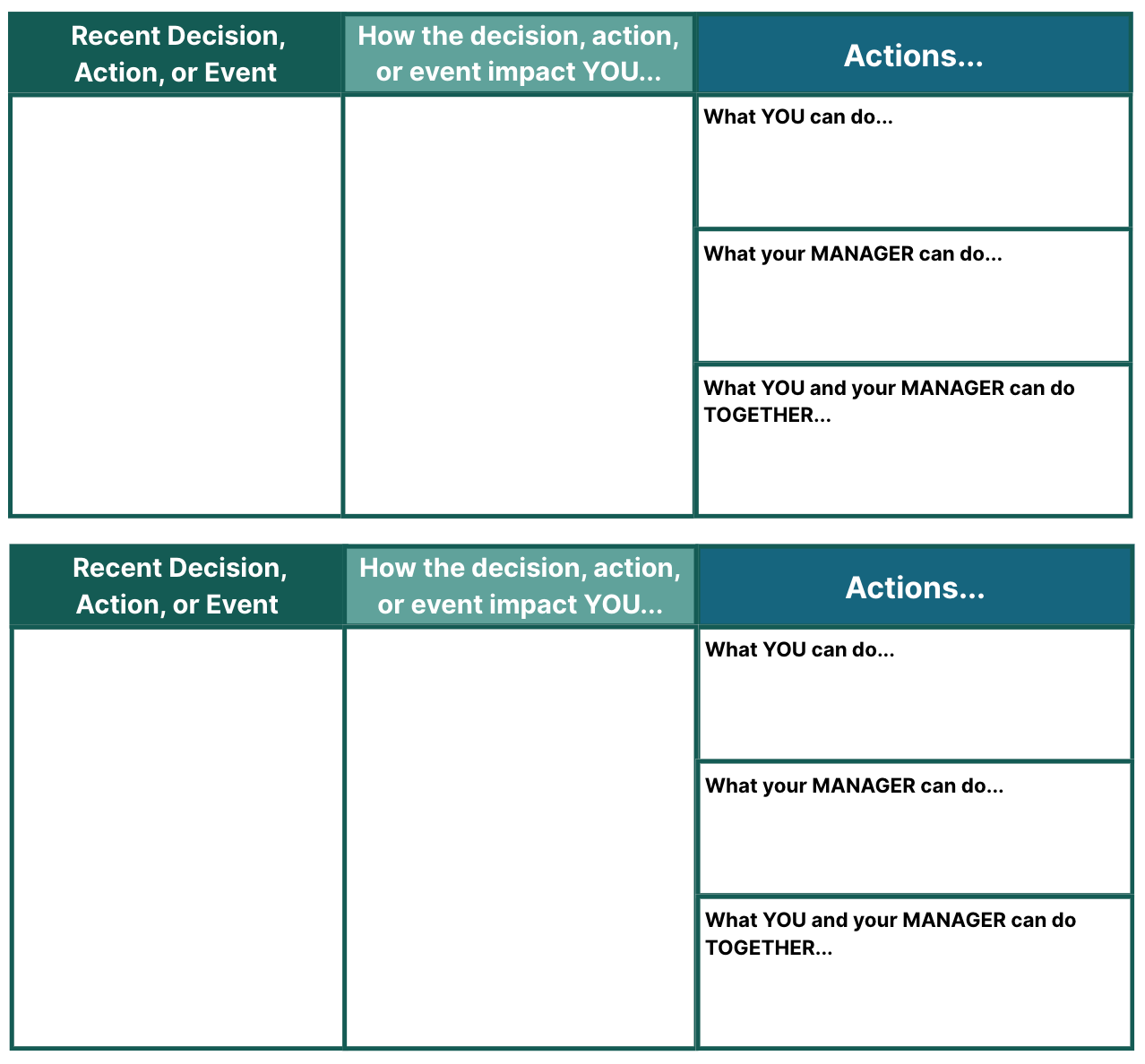STEP 3: In a discussion, ask your team member to talk about each decision or event and the impact created. Be sure to focus on creating an understanding of the individual’s perspective.