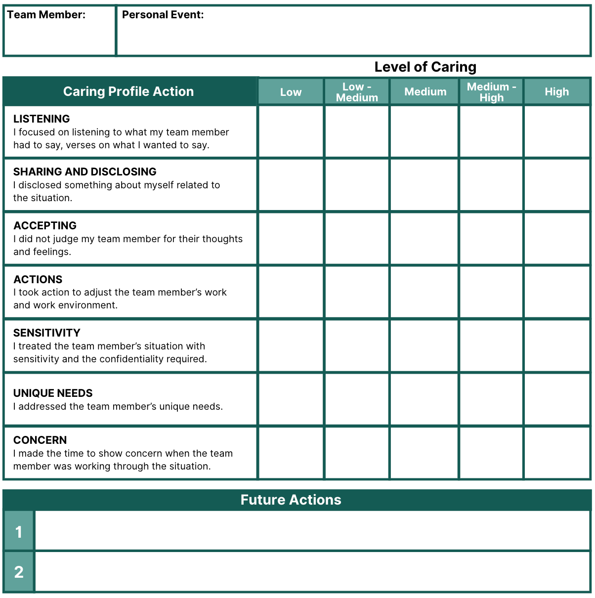 STEP 3: Based on your responses, identify two actions you will take in the future to increase the level of caring you show your team members.