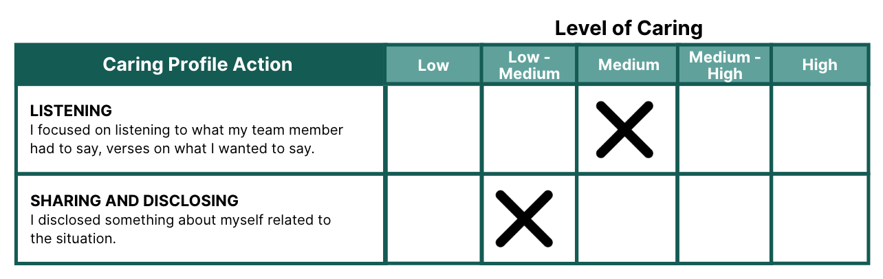 STEP 2: Review the Caring Profile Actions. Based on your own perception, determine what level of “caring” you offered the team member for each Caring Profile Action.
