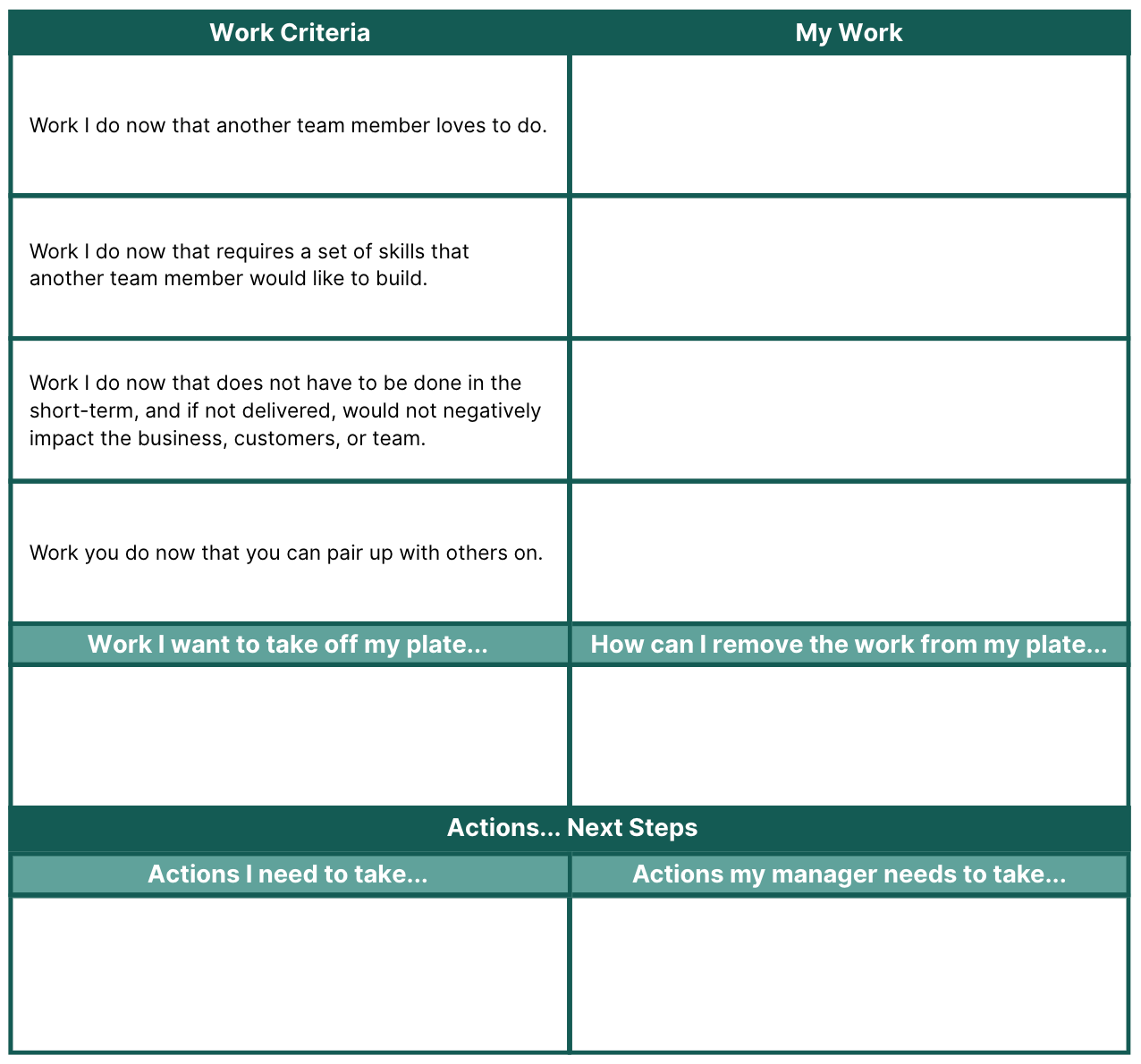 STEP 4: Together, identify the actions you and your manager need to take in order to remove the work/deliverable from your plate.