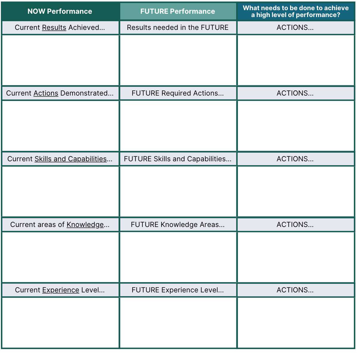 STEP 3: Based on the difference between the “NOW Performance” and the “FUTURE Performance,” identify the actions which can be taken to make sure the team member is delivering high performing results in the future.