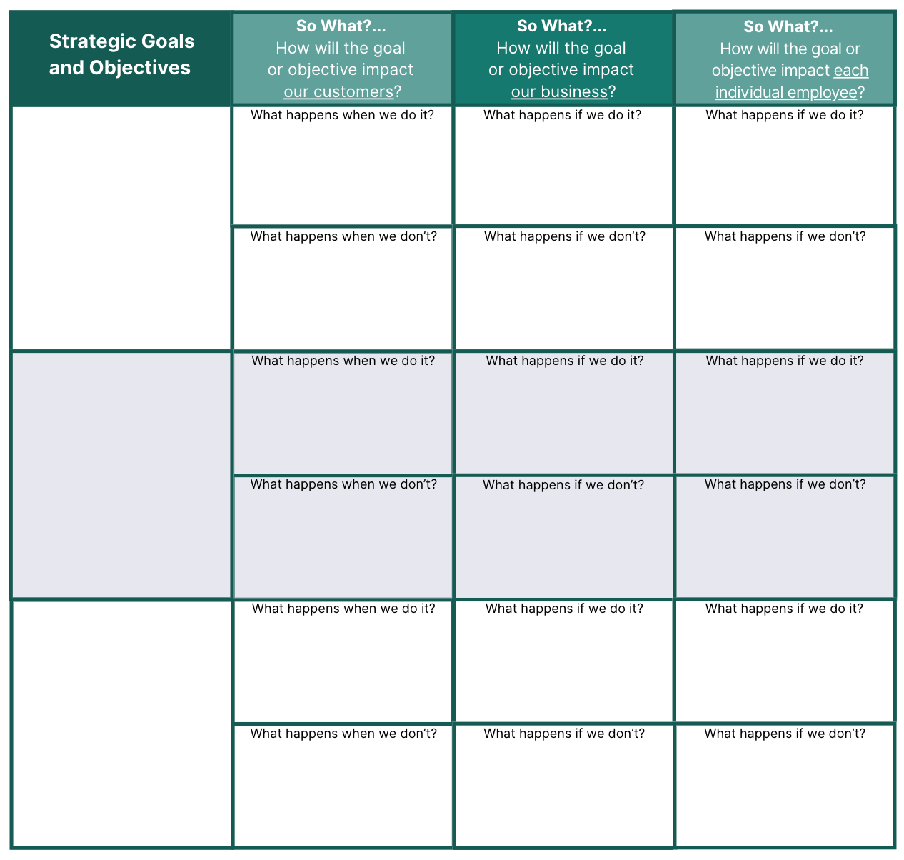 STEP 1: In a team meeting, use the So What? Template to facilitate a discussion regarding the organization’s strategic goals and objectives.