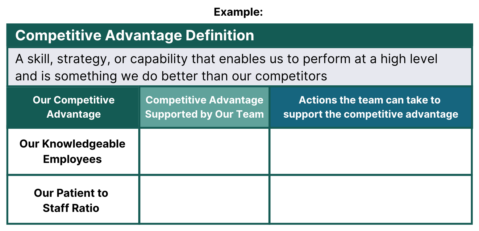 STEP 1: During a team meeting, discuss the definition of “competitive advantage.” Capture the definition on a flip chart or dry erase board.Â