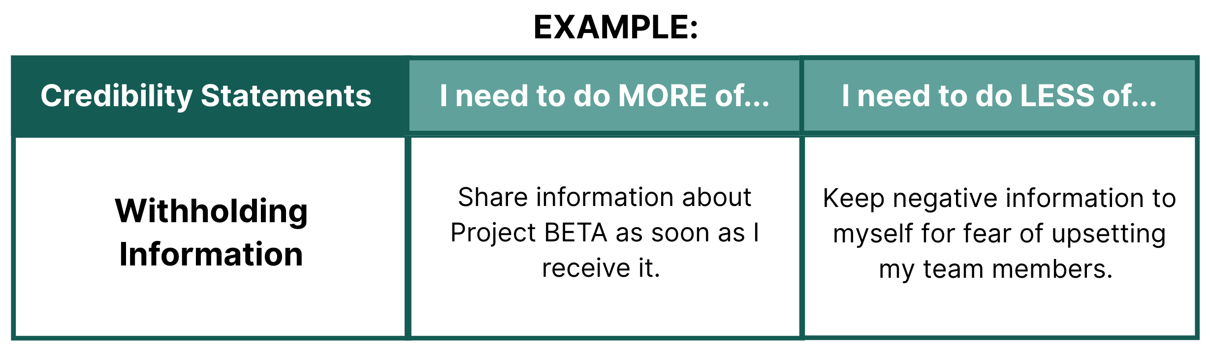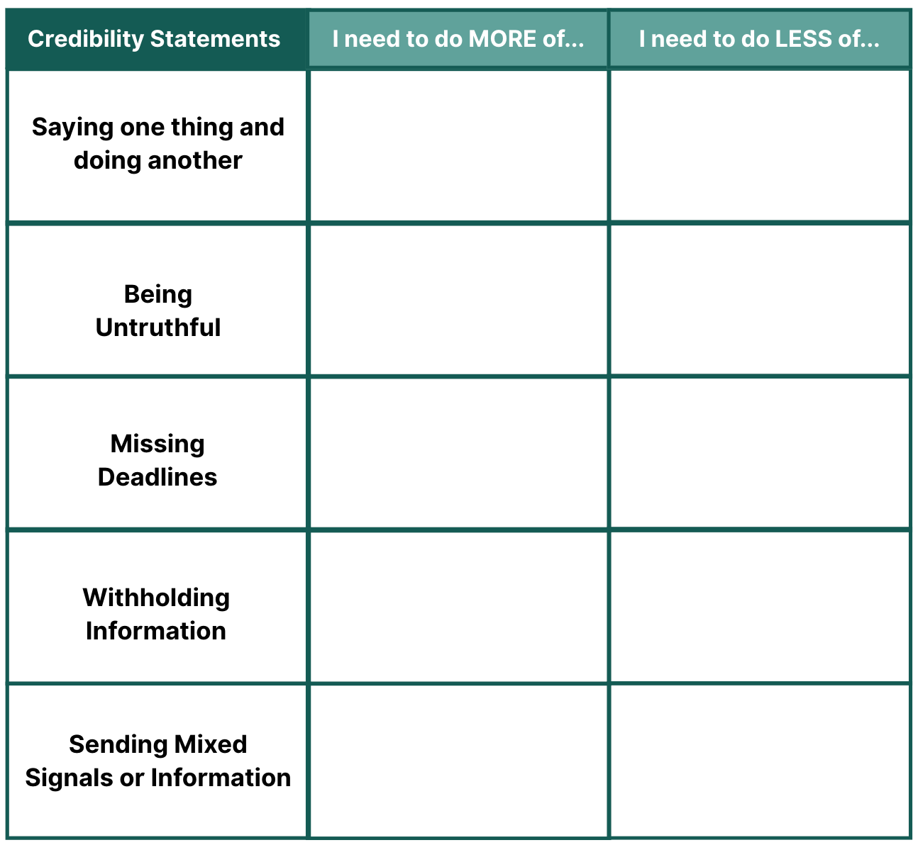STEP 4: Periodically review your Credibility Self-Assessment to determine if you were able to increase the actions you need to do “more of,” and reduce or eliminate the actions you need to do “less of.”Â