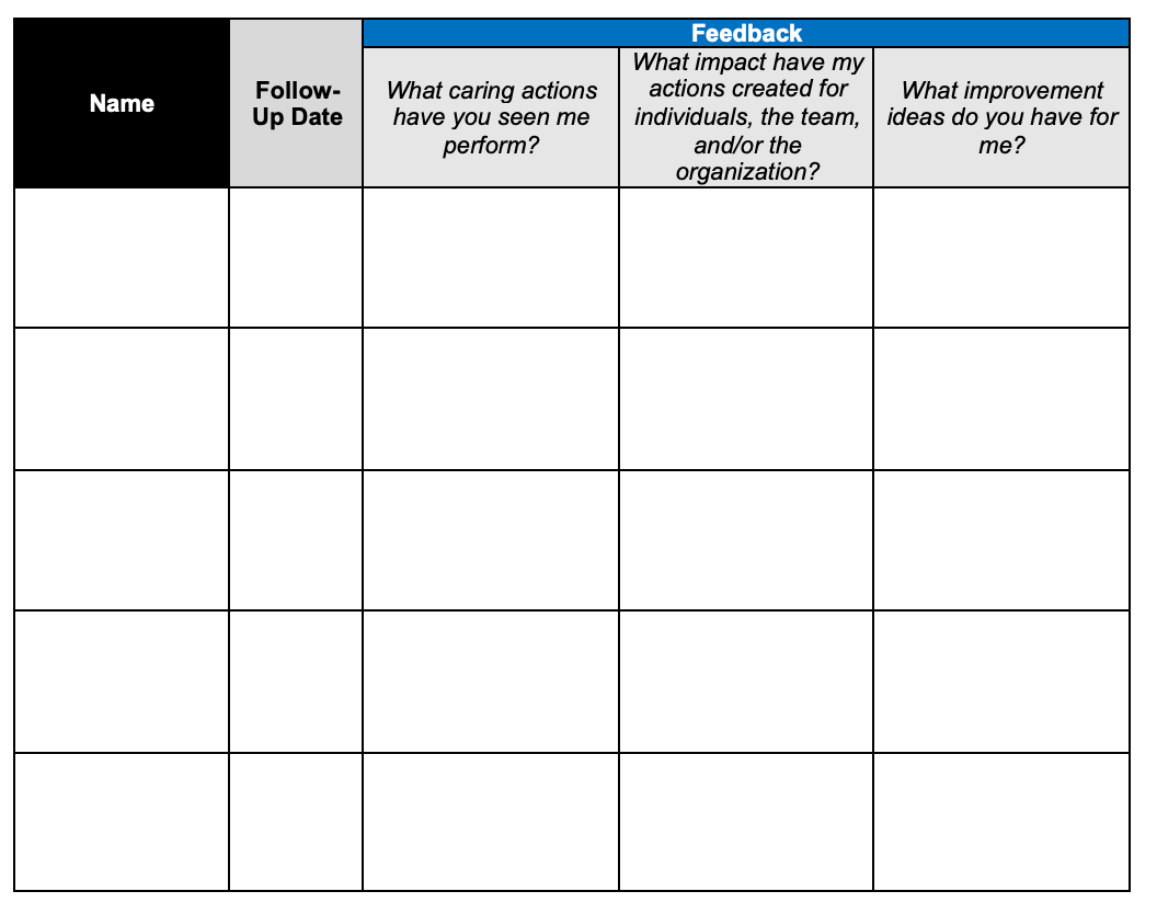STEP 3: At the time of your follow-up dates, schedule a 15 minute discussion with each person to receive feedback on your caring actions.