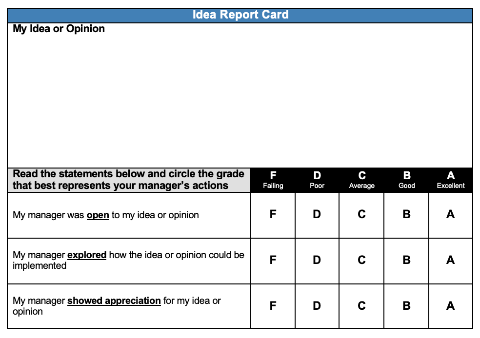 STEP 1: After a team member presents an idea or opinion to you (e.g., “There are a few weaknesses in the product design; we may want to consider redesigning parts 3 and 5,”), the team member completes the Manager Idea Report Card.