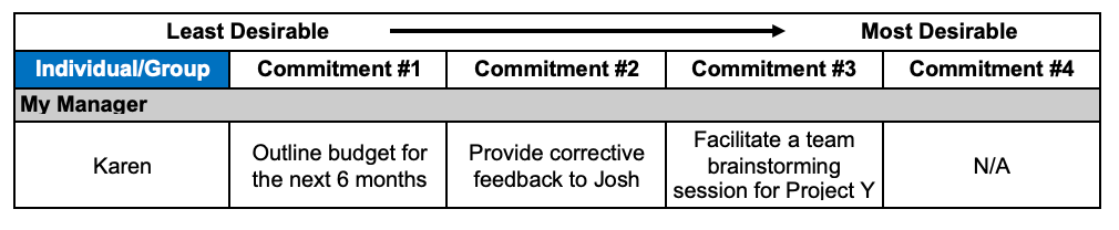 STEP 2: For each individual or group, rank your commitments from LEAST DESIRABLE (#1) to MOST DESIRABLE (#4).