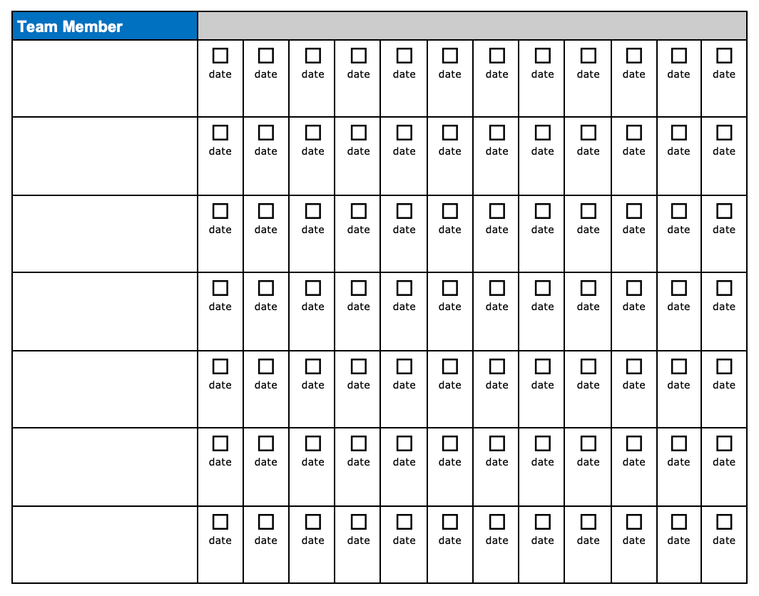Note: See if you can place a check mark next to each team member’s name at least once a week.